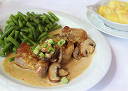mit Kartoffelgratin, Champignons, Rahmsauce und knackige grüne Bohnen