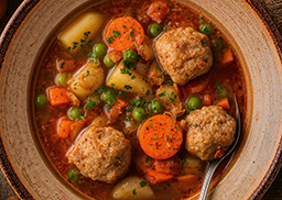 mit Fleischbällchen, Erbsen, Karotten, Kartoffeln, Zwiebeln, Knoblauch und Petersilie