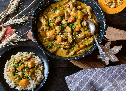 mit Kürbiswürfeln und Herbstgemüse auf lockerem Parboiled Reis