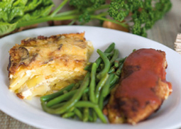 an delikatem Kartoffelgratin, dazu Prinzessbohnen