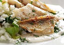 mit Porree und Reis-Wildreis-Mischung auf feiner Dillsauce