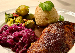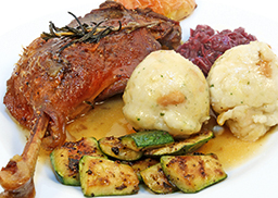 mit Apfelrotkohl, gebratenem Rosenkohl und Semmelknödel