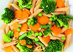 mit Penne, Broccoli, Erbsen und Karottenscheiben