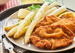 auf weißem Spargel und Hollandaise, dazu empfehlen wir Kartoffelröstinchen