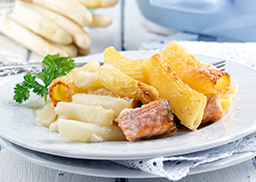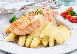 mit MSC-Lachswürfeln und Spargel Tips&Cuts, dazu Hollandaise