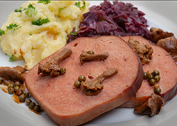 im Bratensaft, dazu Rotkohl und Semmelknödel
