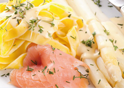und geräuchertem Lachs, dazu Sauce Hollandaise