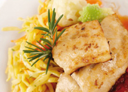 auf Fettuccine und Tomatenragout, dazu Romanescomischung