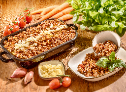 Bio-Rinderhackfleischzubereitung mit Tomatenmark und Möhren-, Zwiebel- und Selleriewürfeln, neutral gewürzt, einzeln entnehmbar, ohne Fett gebraten