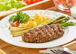 Hergestellt nach deutschem Handwerksbrauch, locker in der Konsistenz mit würzigem Geschmack aus frischem Schweine- und Rindfleisch beidseitig in Fett gebraten.