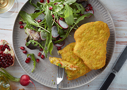 leckeres Gemüseschnitzel mit Möhren, Blumenkohl, Erbsen und Mais in vier kreativen Formen - gemischt in einem Beutel - unterstreichen die „Handmade“- Optik des vegetarischen Klassikers, vorgebacken