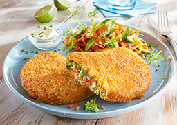 aus Brokkoli, Karotten, Erbsen und ganzen Dinkelkörnern, ist umhüllt von einer knusprigen Panade, vorgebacken