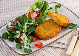 Vegetarische Frikadelle aus Quinoa und Kürbis, verfeinert mit Pastinaken und Amaranth, vorfrittiert