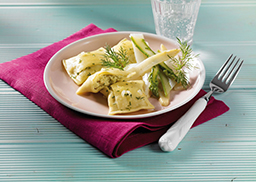 Nudelteig gefüllt mit weißem und grünem Spargel, kombiniert mit Quark, Lauch, Frühlingszwiebeln, Kartoffeln und Karotten