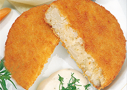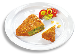 saftiges Medaillon aus Blumenkohl und Kartoffelflocken, schmackhaft gewürzt, in einer knusprigen Panade, vorfrittiert