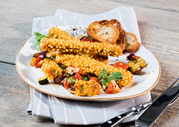 Sticks, aus Reis, exotischen Früchten und Gemüse geformt, in einer knusprigen Panade, küchenfertig zubereitet, vorgegart