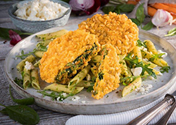 Panierter Schmelzkäsebratling gefüllt mit Tomaten-Mozzarella-Sauce, Eisen zugesetzt,