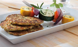 Hergestellt aus Kartoffelraspeln, Zucchini, Möhren, Zwiebeln, Sonnenblumenkernen, Gewürzen und Kräutern, ausgeformt und vorgebacken
