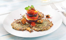 Karree aus Schwarzwurzeln, Emmentaler, Maißgrieß, würzig abgeschmeckt und umhüllt von einer krossen Panade mit Sesam