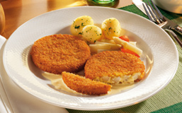 Vegetarisches Erzeugnis nach Art eines Schnitzels, auf Basis hochwertiger Proteine aus Soja und Eiklar, fertig gebraten