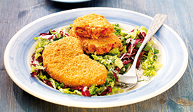 runder Bratling aus zartem Spargel und mildwürzigem Käse, knusprig paniert