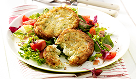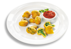 Hergestellt aus Kartoffelraspeln, Broccoli, Zwiebeln, Mandeln und Gewürzen ausgeformt und vorgebacken