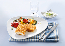 Weichkäse grieschische Art, paniert mit Kartoffelpanade, vorgebacken