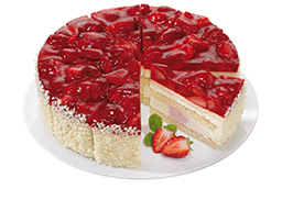 Zwischen zwei hellen Muffinböden liegt ein Duett aus feiner Bourbon-Vanille-Sahne- und Erdbeer-Jogurt-Sahne-Füllung. Darauf eine Bourbon-Vanillesahne und ein heller Biskuitboden. In 12 Stücke vorgeschnitten.