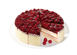 Leckere Komposition aus einer erfrischenden Jogurtsahne und Himbeersahnecremefüllung, zwischen lockeren Tortenböden. Ganzflächig bedeckt mit aromatischen Himbeeren und randgarniert mit weißen Schokorondies. In 12 Stücke vorgeschnitten.