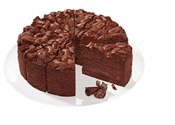 Leckere Kakaocreme liegt zwischen dunklen Schokoladenrührteigböden, dekoriert mit Schokoladenrührteigwürfeln und dunklen Kringeln aus Kakaocreme. In 12 Stücke vorgeschnitten.
