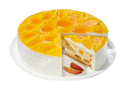 Fruchtig-frische Tortenversuchung! Auf einem Mürbeteigboden liegt zwischen zwei lockeren Biskuitböden ein Duett aus Crème-Fraîche-Sahne und Pfirsichfruchtzubereitung. Darauf eine fruchtige Pfirsich-Mango-Sahne-Füllung und ein weiterer Biskuitboden.