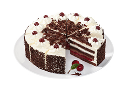 Auf lockerem Boden liegt eine Kirschfruchtzubereitung, bedeckt von einer Kakao-Sahnefüllung. Darauf wechseln sich dunkle Biskuitböden mit Kirschwasser-Sahne ab. Dekoriert mit Garnierkirschen und Schokospänen. mit Alkohol, In 12 Stücke vorgeschnitten.