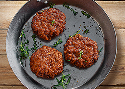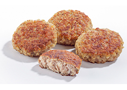 Geflügelfrikadelle von mittelfreier Körnung und sehr milder Würzung, vereinzelt Kräuter und Gewürze, ohne Fett gebraten
