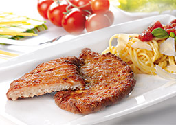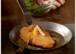 Knusprig paniertes Hähnchen-Brustfilet als Schnitzel „Wiener Art“, abgeschmeckt mit einer würzigen Marinade, gegart, gebräunt
